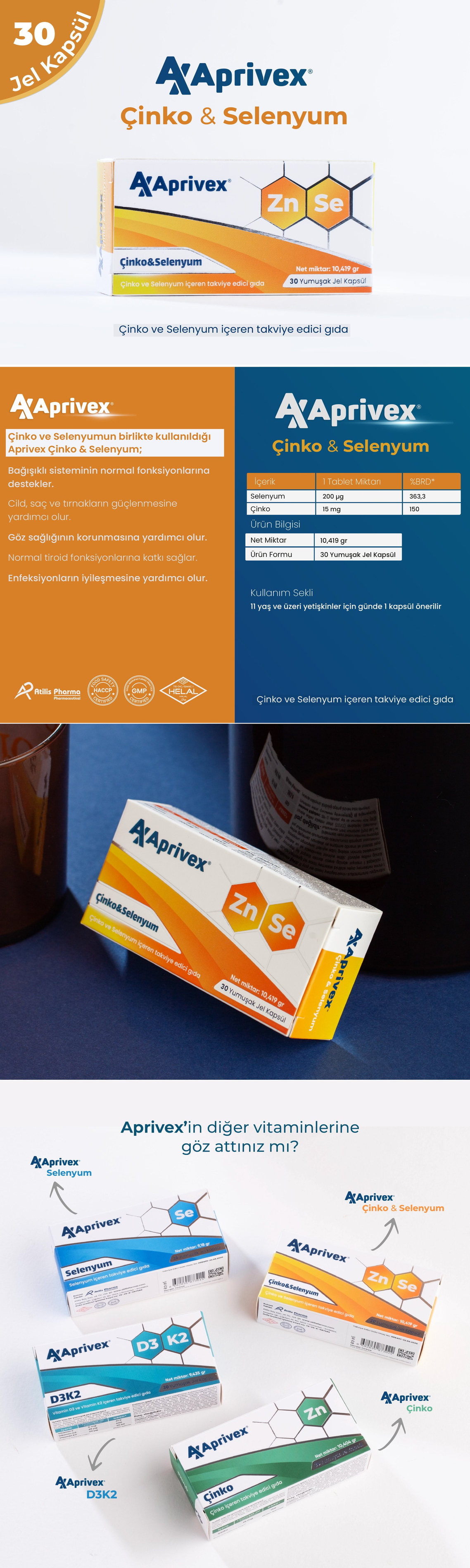 Aprivex, 15 mg çinko ve 200 mikrogram selenyum içeren takviye edici gıdadır. 30 yumuşak jel kapsül içeren kutularda sunulmaktadır (boyut: 953 cm).