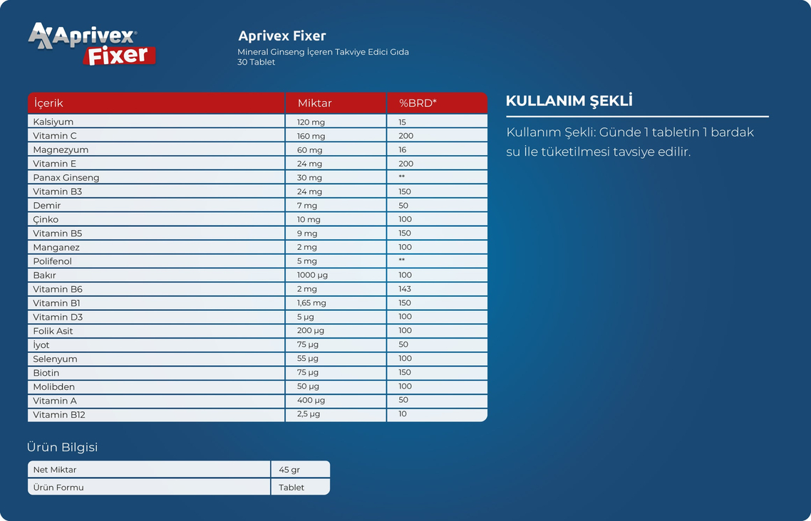 Aprivex Fixer Multivitamin Mineral ve Ginseng - 30 Tablet